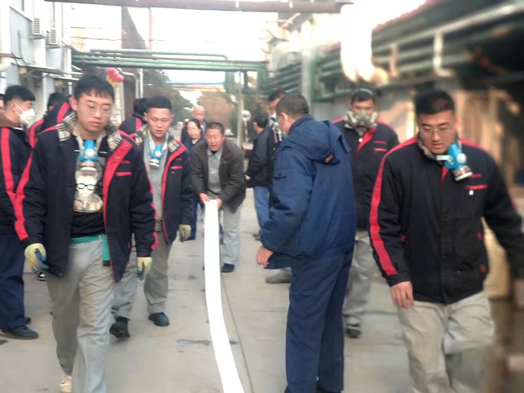 演練模擬原料車間合成一室發(fā)生火災(zāi)爆炸,車間立即啟動(dòng)應(yīng)急預(yù)案,進(jìn)行實(shí)際演練。